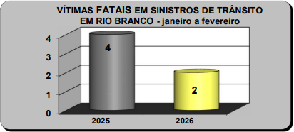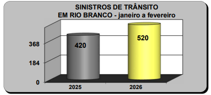 Segundo dados da Coordenadoria de Engenharia e Estatística de Trânsito (CEET), os registros de acidentes de trânsito em Rio Branco aumentaram em 2026 em comparação com o mesmo período de 2025. Nos meses de janeiro e fevereiro deste ano foram contabilizados 520 sinistros, enquanto no mesmo intervalo do ano passado foram registrados 420.