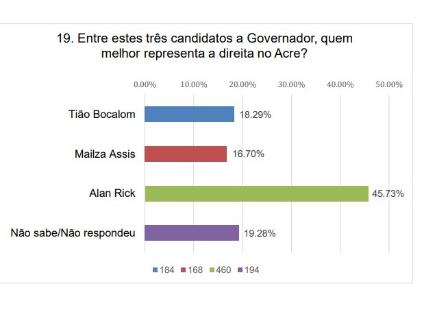 A pesquisa divulgada na segunda-feira (23) e realizada pela agência Delta, encomendada pela TV Gazeta, revela que o senador Alan Rick (Republicanos) desponta isolado como o nome que melhor representa a direita no Acre, somando 43,73% das intenções de voto. Nesse cenário, o parlamentar estabelece uma vantagem considerável sobre os demais concorrentes citados no levantamento.