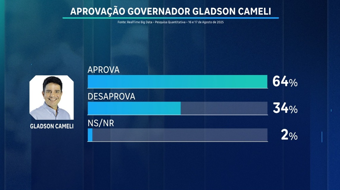 O governador do Acre, Gladson Camelí (PP), aparece com mais de 60% de aprovação popular, segundo pesquisa do Instituto Real Time Big Data divulgada pela TV Gazeta na manhã desta terça-feira (19). O levantamento foi realizado nos dias 16 e 17 de agosto, com 800 entrevistas, margem de erro de três pontos percentuais e nível de confiança de 95%.