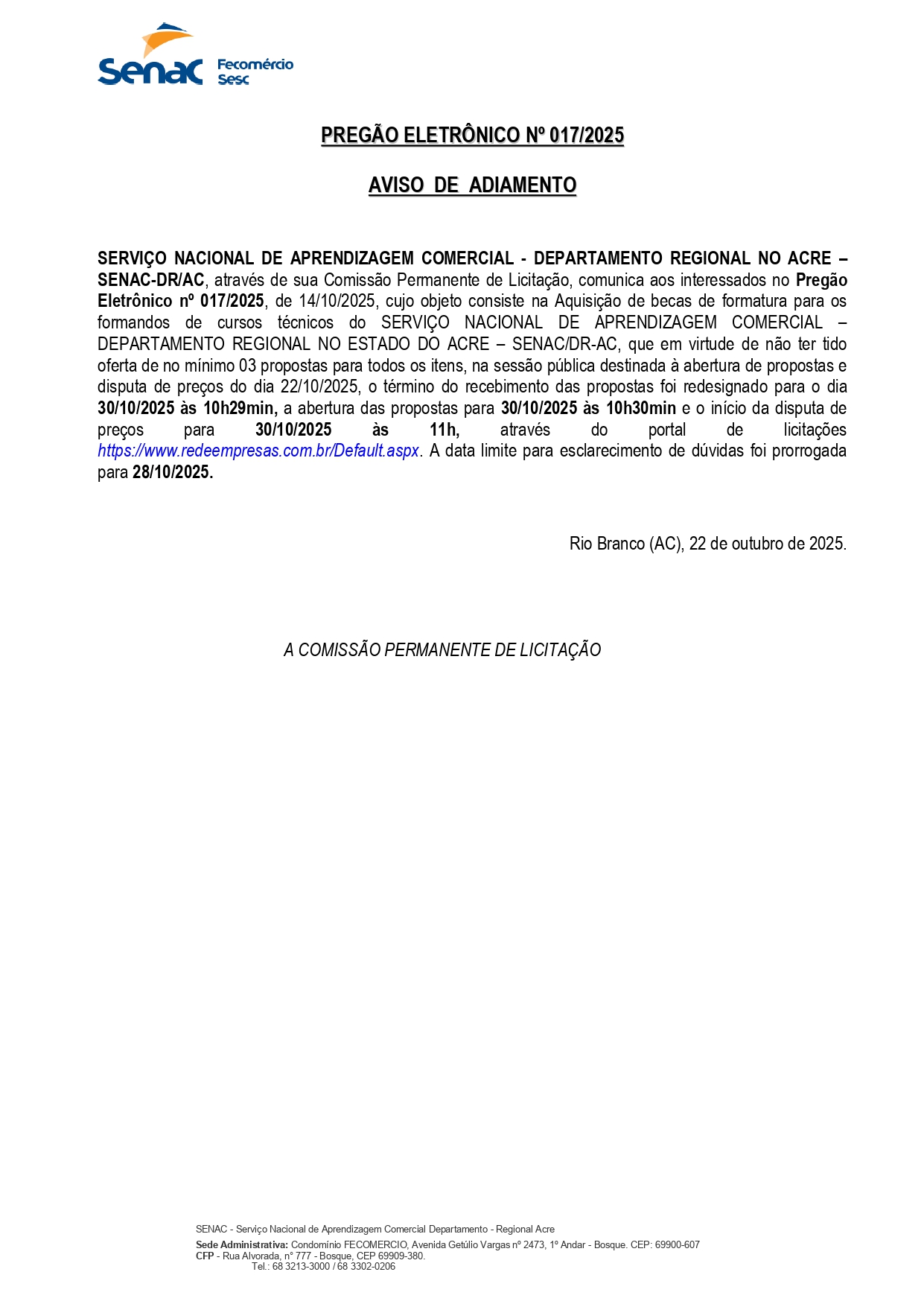 Aviso de Adiamento Pregão Eletrônico n° 17/2025 Senac-DR/AC