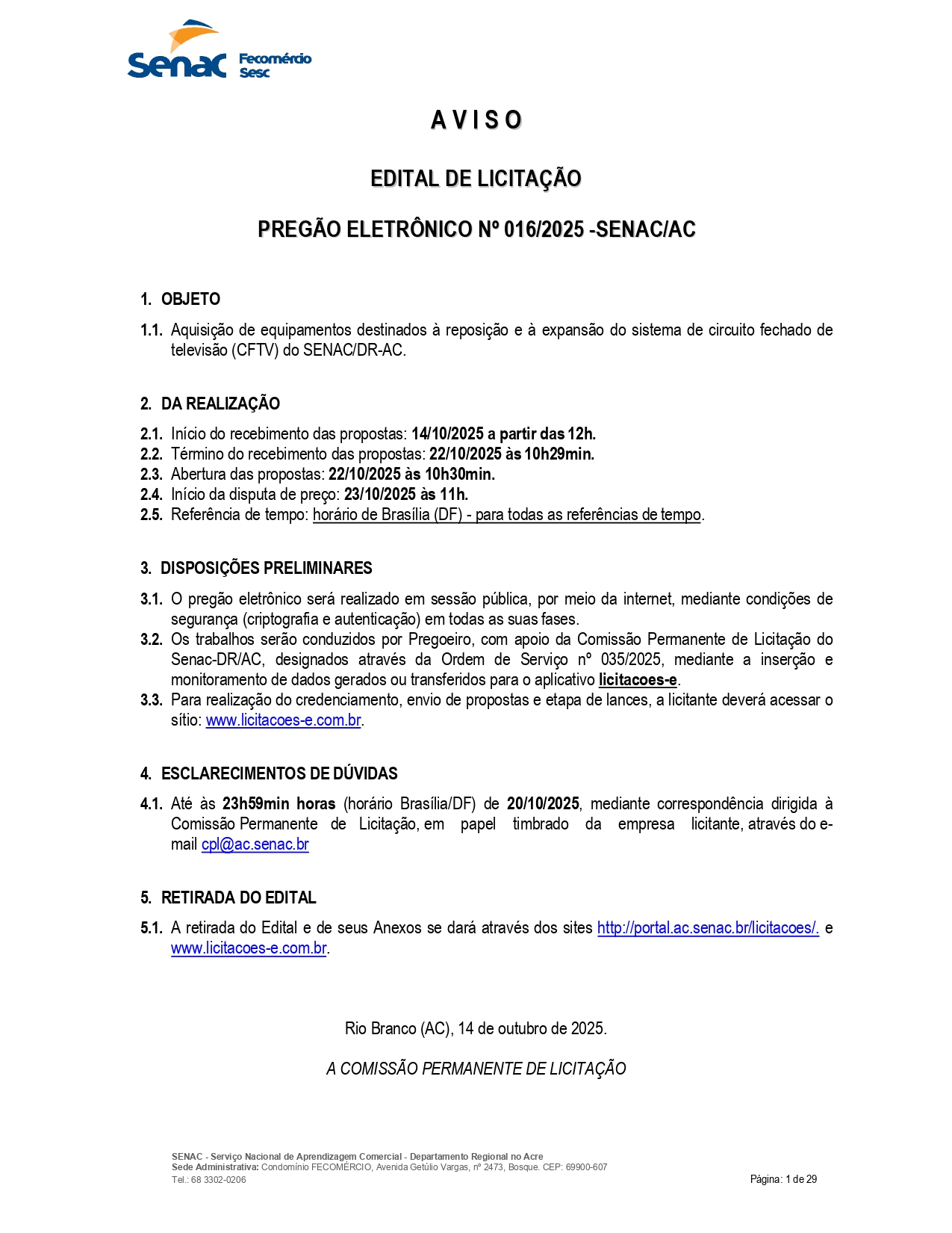 • Aviso de Concorrência 003.2025 Senac-DR/AC 12 de dezembro de 2025