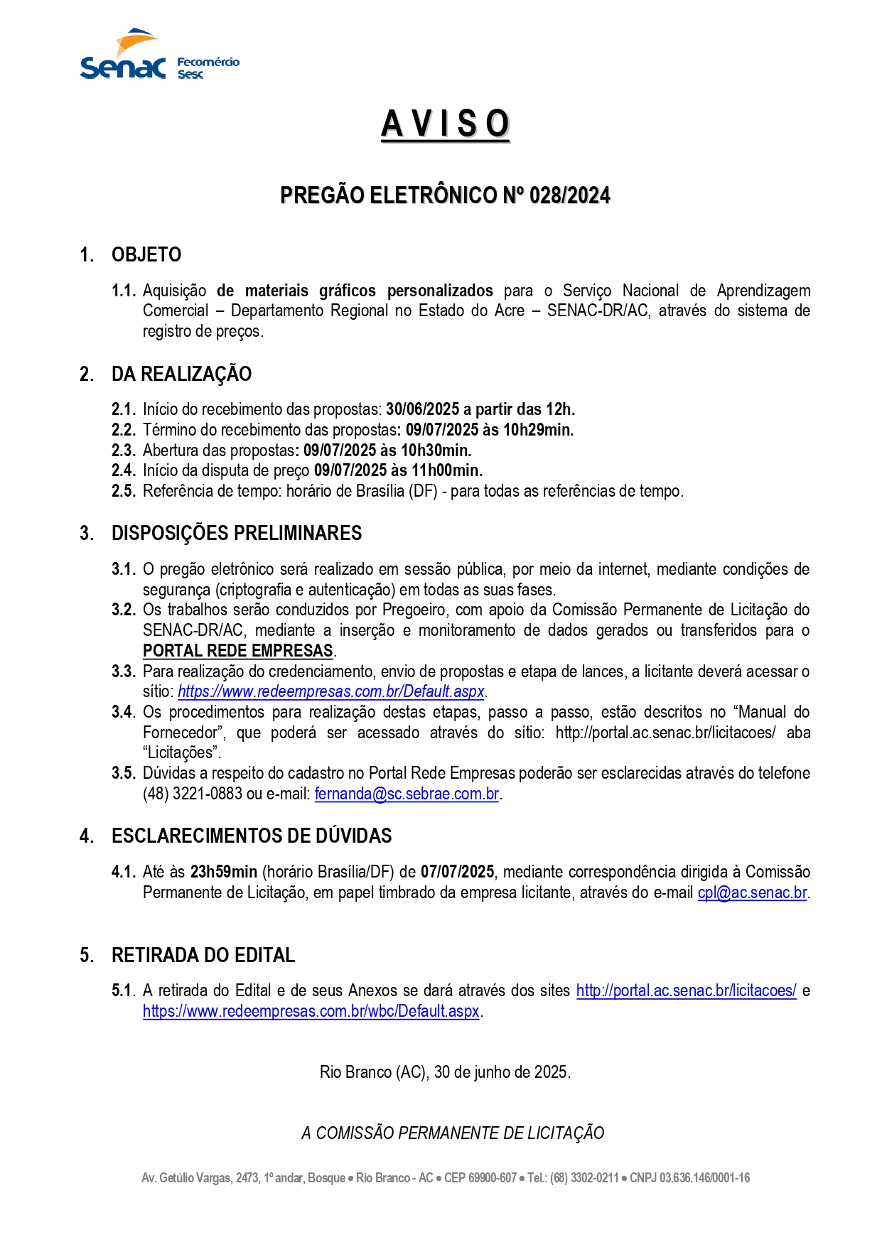 Aviso de Pregão Eletrônico n° 028/2024 Senac-DR/AC