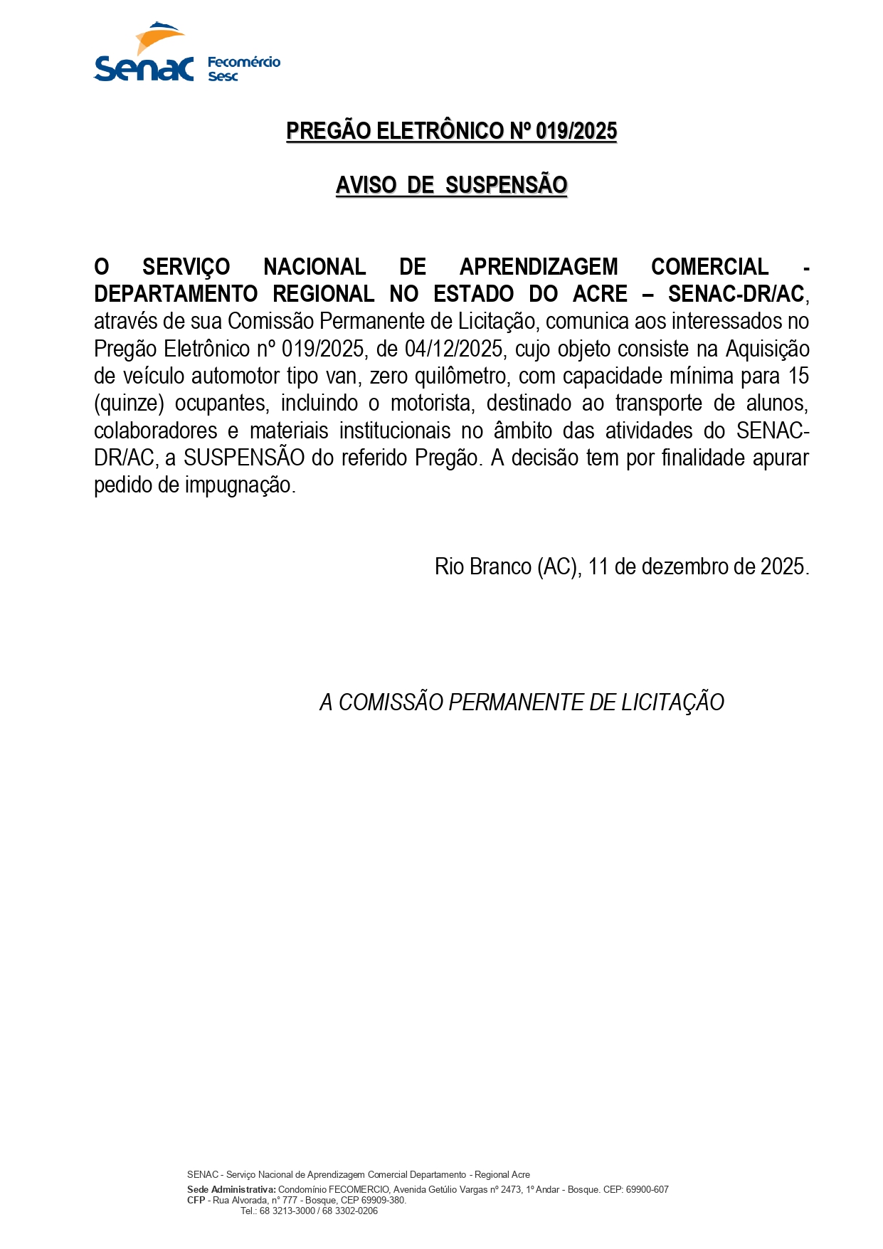 • Aviso de Suspensão Pregão Eletrônico n° 019/2025 11 de dezembro de 2025