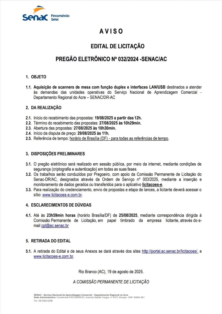 Aviso Edital de Licitação Pregão Eletrônico n° 032/2024 – Senac/AC