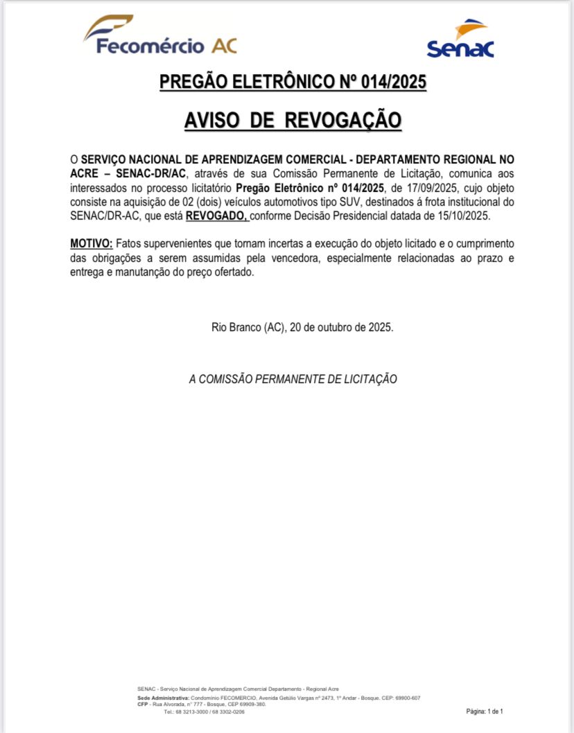 Aviso Pregão Eletrônico N° 014/2025 Senac-DR/AC