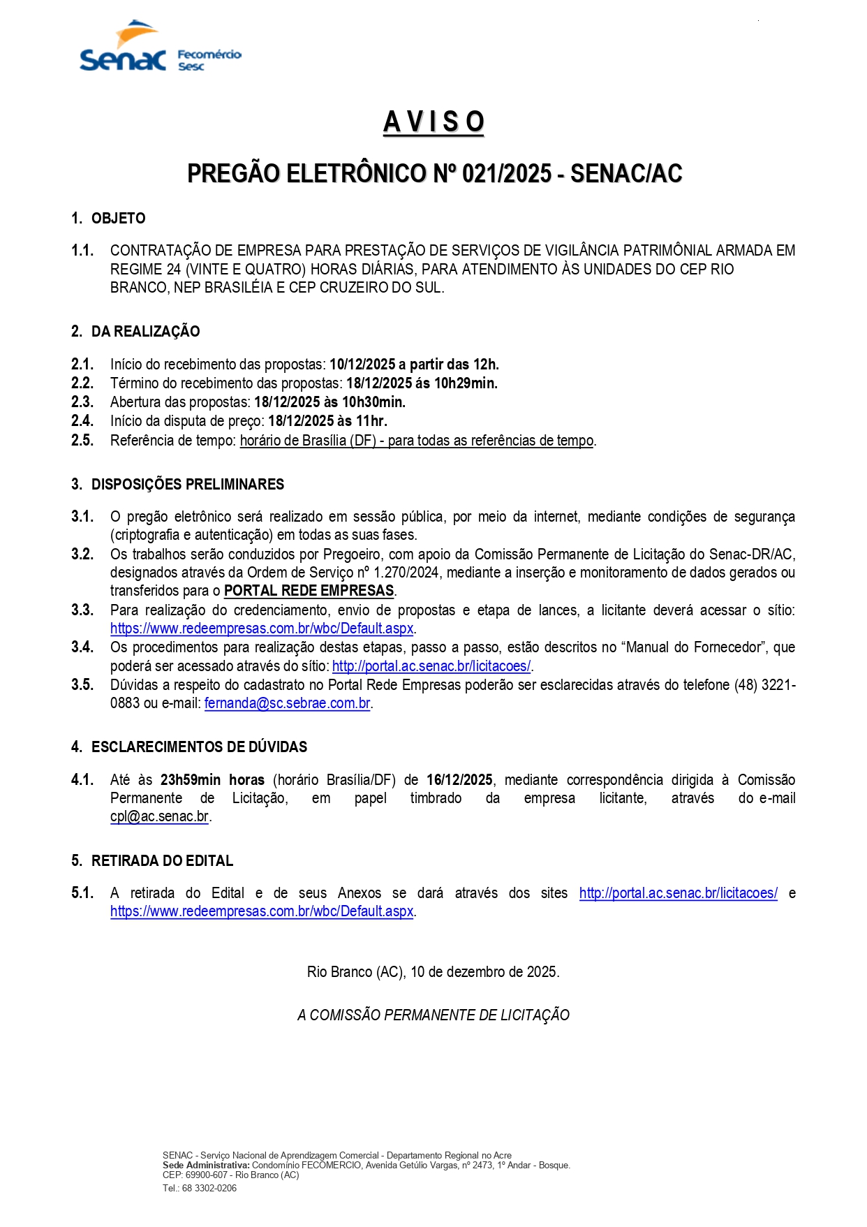 • Aviso Pregão Eletrônico n° 021/2025 Senac/AC 10 de dezembro de 2025