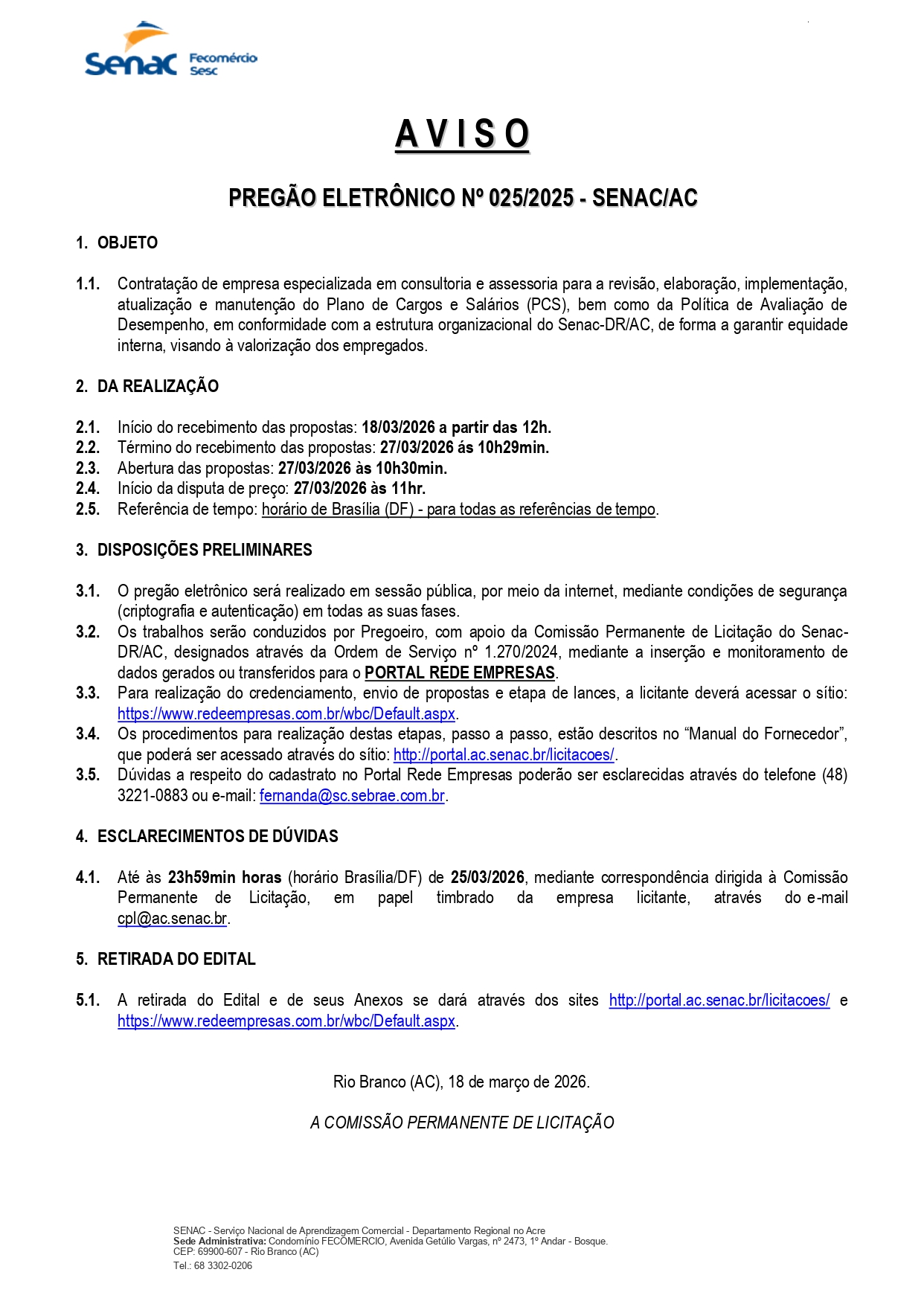 • Aviso Pregão Eletrônico n° 025/2025 – Senac/AC 18 de março de 2026