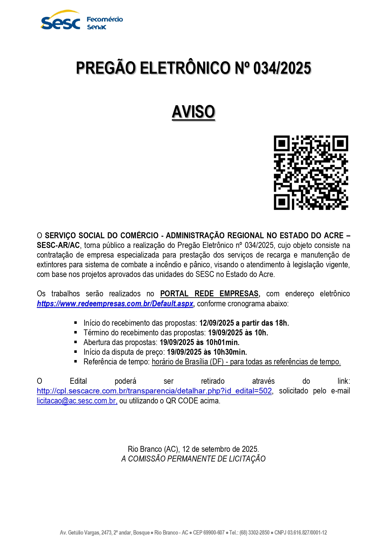 Aviso Pregão Eletrônico n° 034/2025 Sesc-AR/AC