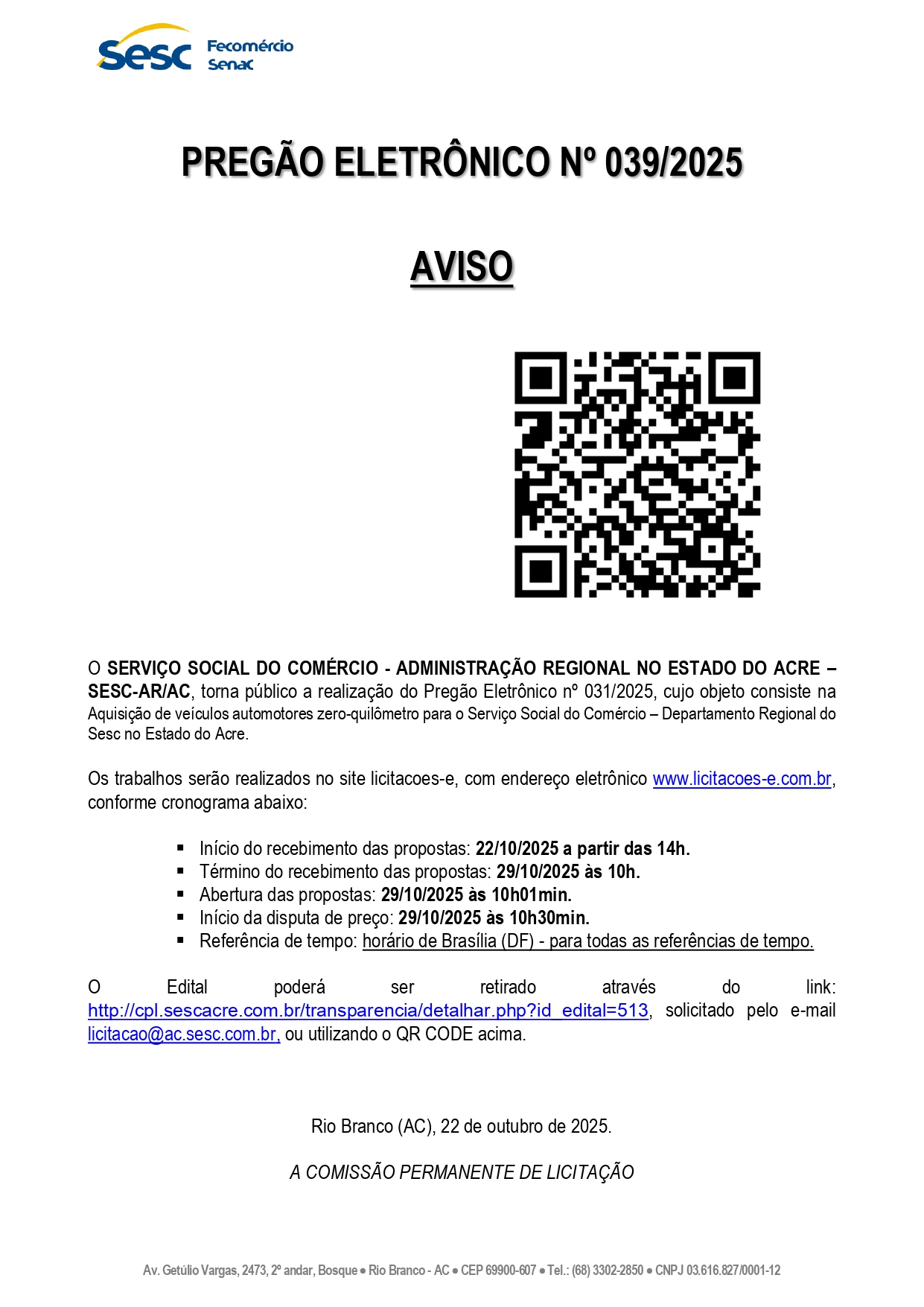 Aviso Pregão Eletrônico n° 039/2025 Sesc-AR/AC