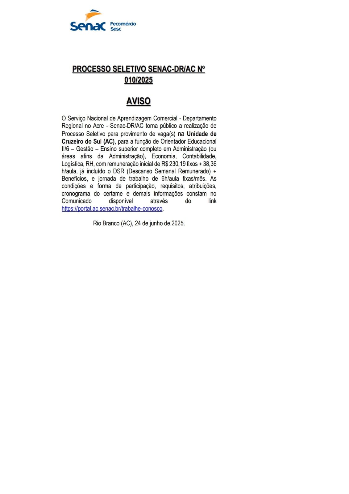 Aviso Processo Seletivo Senac-DR/AC n° 010/2025
