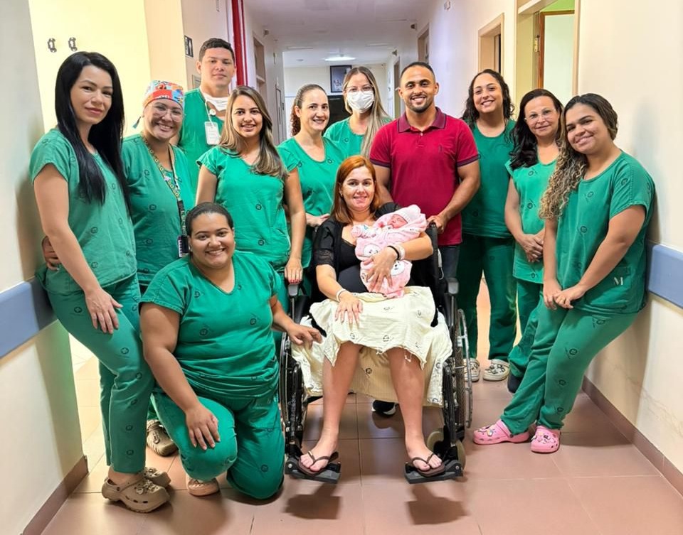 Equipe médica do Hospital Santa Juliana posa com os pais e a recém-nascida Esther após o parto, que ocorreu no mesmo dia do aniversário do casal. - Imagem: Cedida