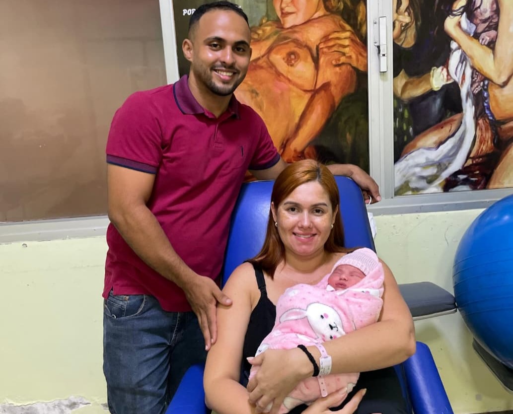 Jaine e Welleson com a pequena Esther nos braços, horas após o nascimento que transformou o dia 5 de fevereiro em uma celebração ainda mais especial para a família. – Imagem: Cedida