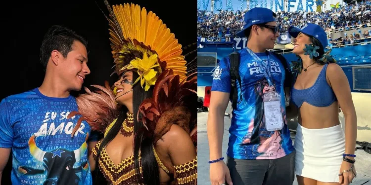 Thiago Yawanawá celebra a vitória do Boi Caprichoso com sua cunhã poranga Marciele Albuquerque