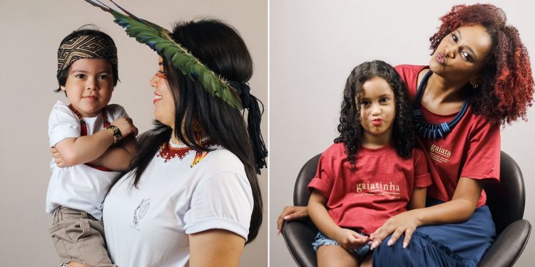 A indígena Andressa Runi Shanenawa e seu filho Tekamaná. À direita, o alto astral de Ju Bernadino e de sua filha Maria Lis