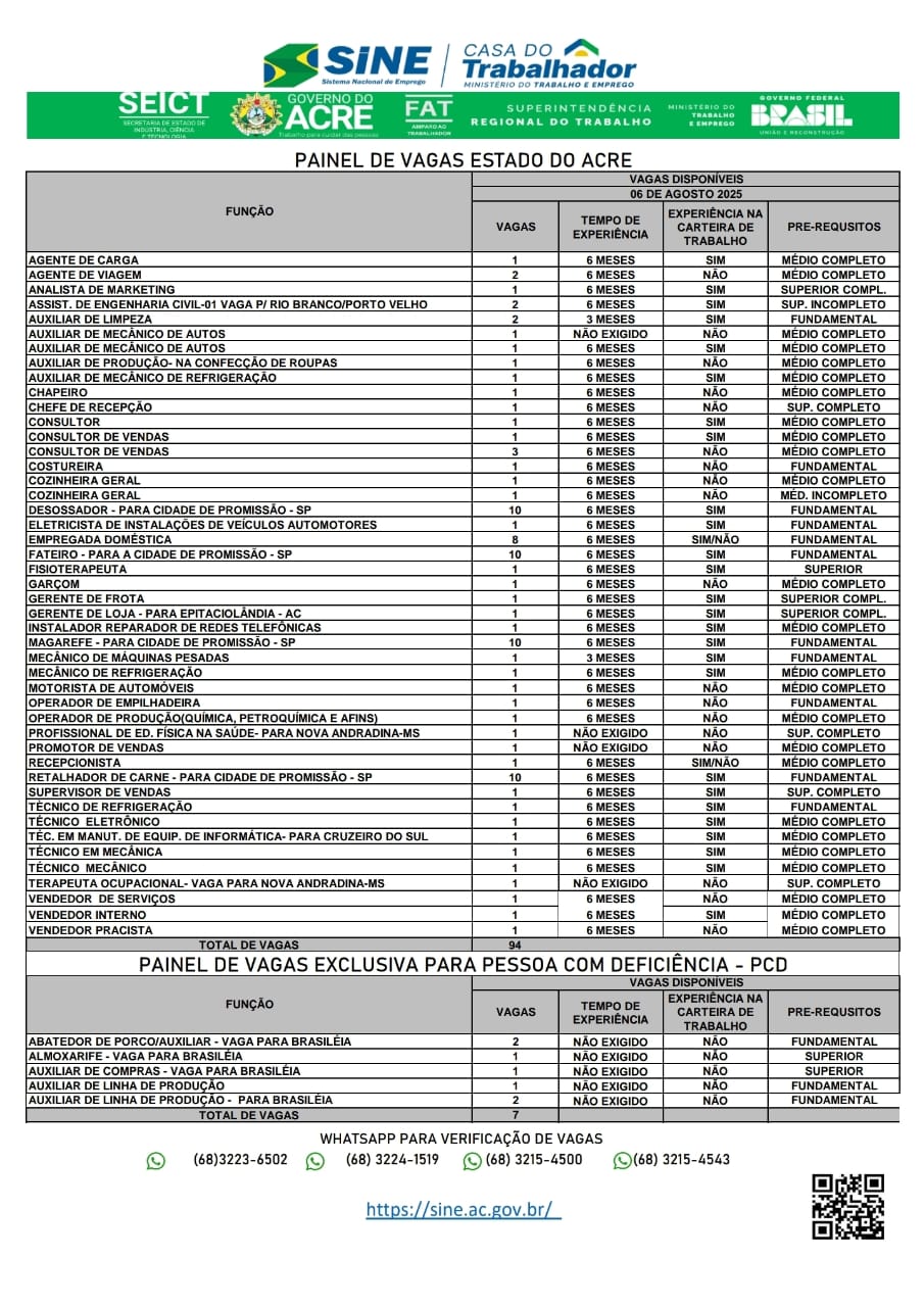 O Sistema Nacional de Emprego do Acre (Sine-AC) oferece 101 vagas de emprego para a população de Rio Branco nesta quarta-feira (6). Destas vagas, sete são destinadas exclusivamente às pessoas com deficiência.