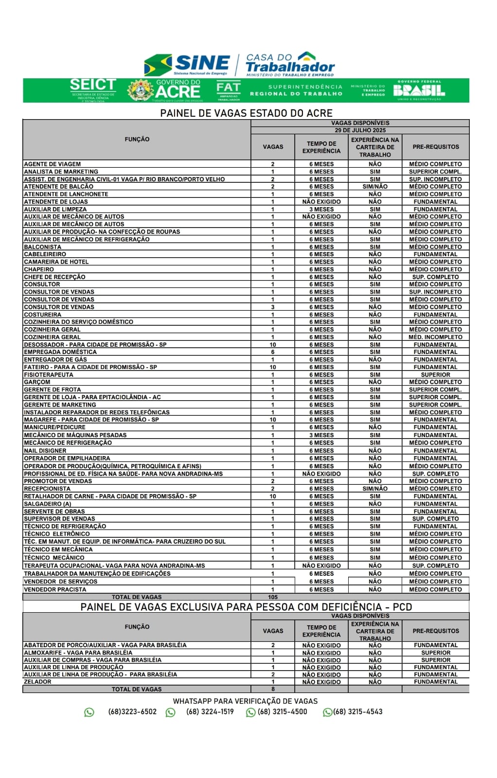 Os candidatos que ainda não possuem cadastro ou que precisam atualizá-lo devem entrar em contato com o Sine para regularizar sua situação. O cadastro pode ser feito via WhatsApp pelos números 3223-6502, 3224-1519 ou 3215-4500.