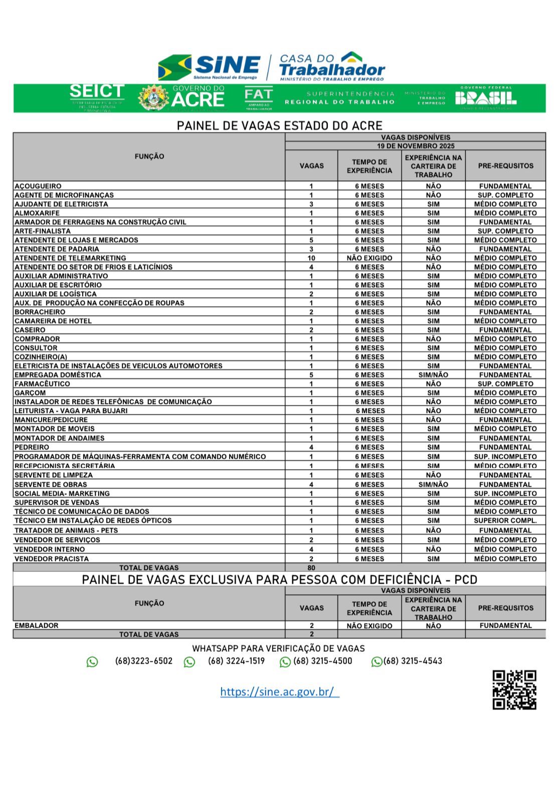 O Sistema Nacional de Emprego do Acre (Sine) oferece 80 vagas de emprego para a população de Rio Branco nesta quarta-feira (24). Destas vagas, duas são destinadas exclusivamente às pessoas com deficiência.