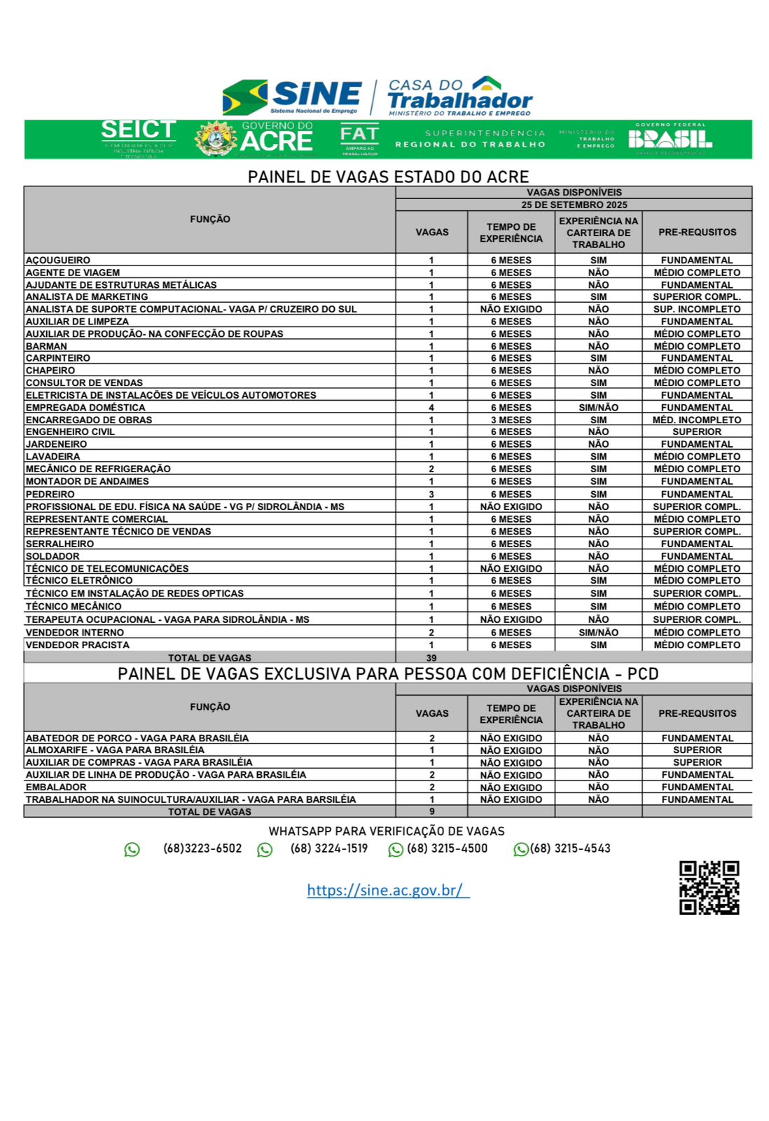 O Sistema Nacional de Emprego do Acre (Sine-AC) oferece 48 vagas de emprego para a população de Rio Branco nesta quinta-feira (25). Destas vagas, nove são destinadas exclusivamente às pessoas com deficiência.