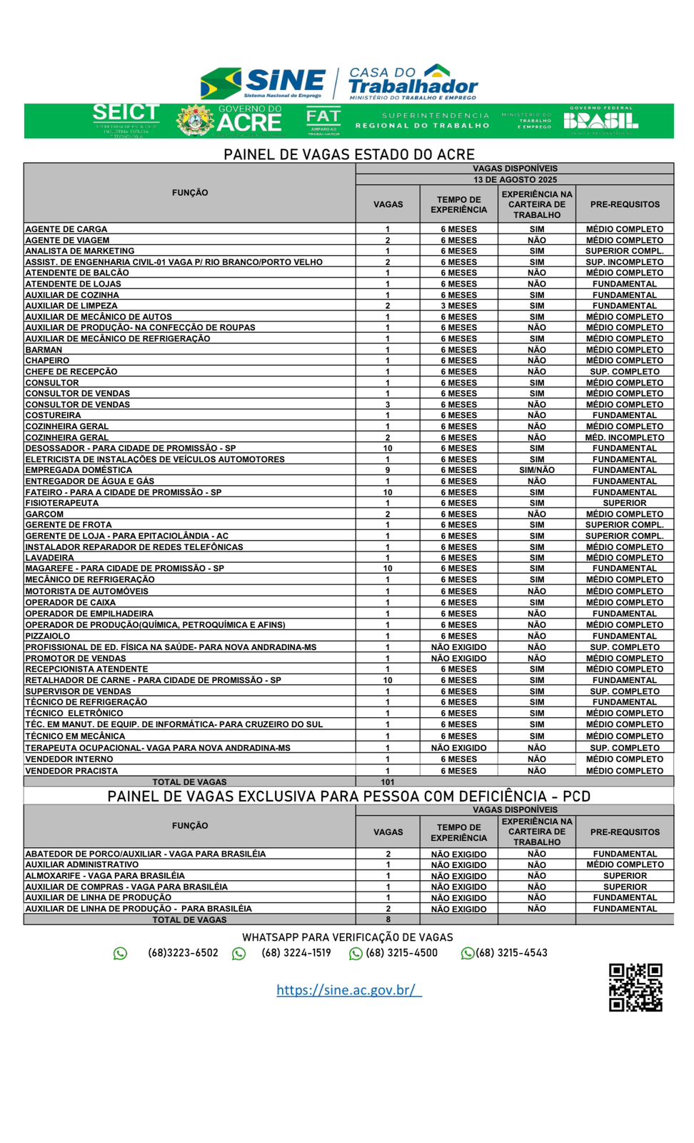 O Sistema Nacional de Emprego do Acre (Sine-AC) oferece 101 vagas de emprego para a população de Rio Branco nesta quarta-feira (13). Destas vagas, oito são destinadas exclusivamente às pessoas com deficiência.