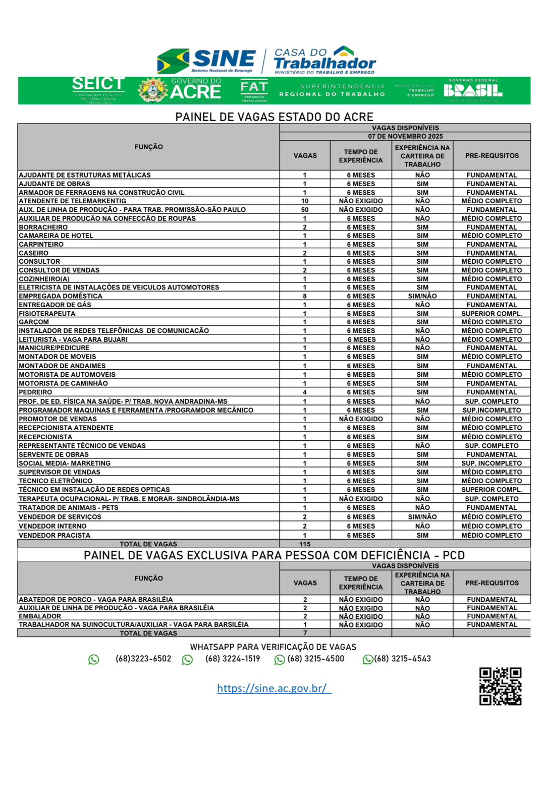 O Sistema Nacional de Emprego do Acre (Sine-AC) oferece 115 vagas de emprego nesta sexta-feira (7). Destas vagas, sete são destinadas exclusivamente às pessoas com deficiência.