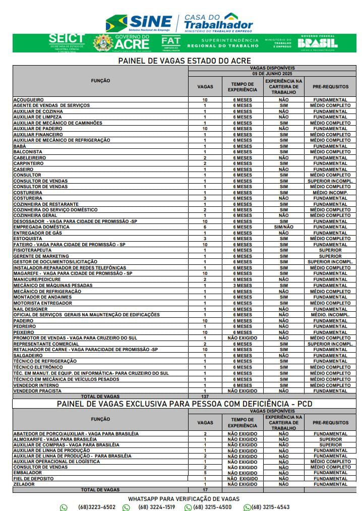 O Sistema Nacional de Emprego do Acre (Sine-AC) oferece 154 vagas de emprego para a população de Rio Branco nesta segunda-feira (09). Destas vagas, 17 são destinadas exclusivamente às pessoas com deficiência.