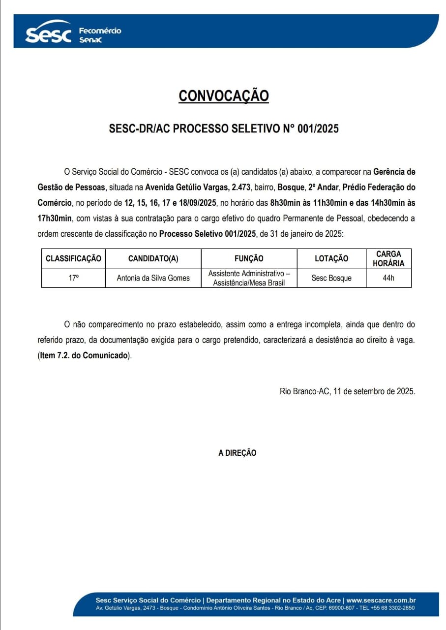 Convocação Processo Seletivo n° 001/2025 Sesc-DR/AC