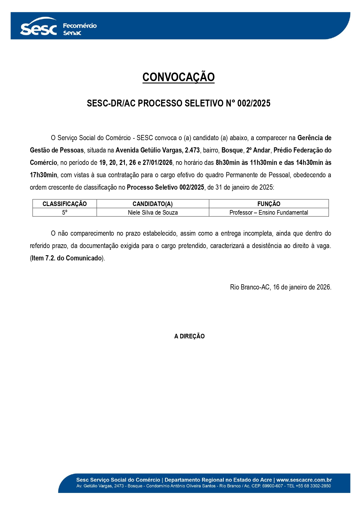 • Convocação Processo Seletivo n° 002/2025 Sesc-DR/AC 16 de janeiro de 2026