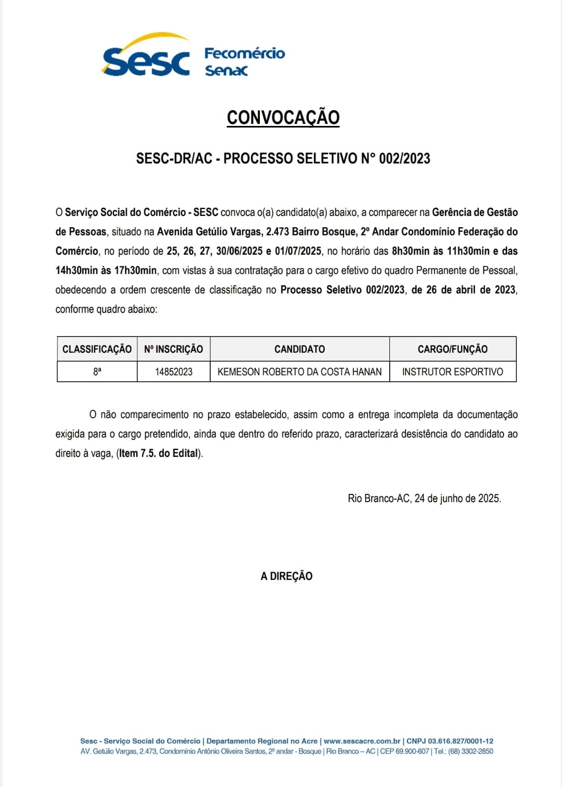 Convocação Processo Seletivo n°002/2023 Sesc-DR/AC