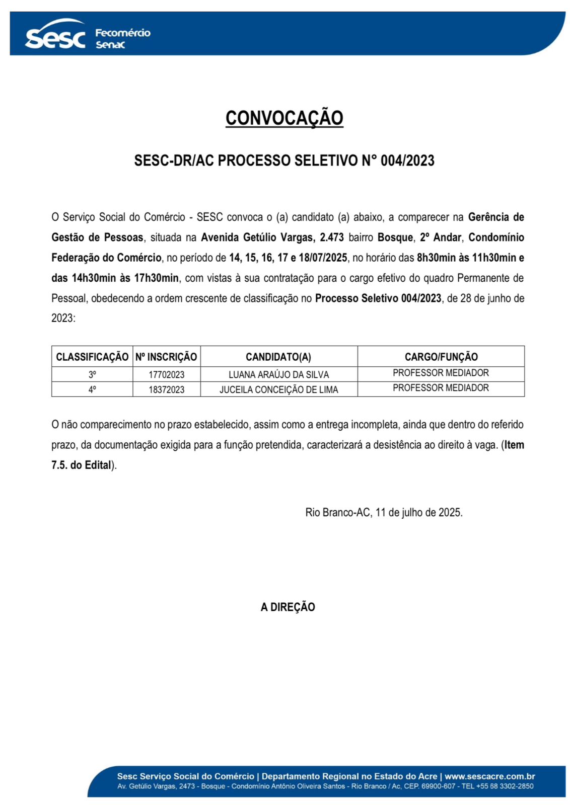 Convocação Processo Seletivo Sesc-DR/AC n°004/2023