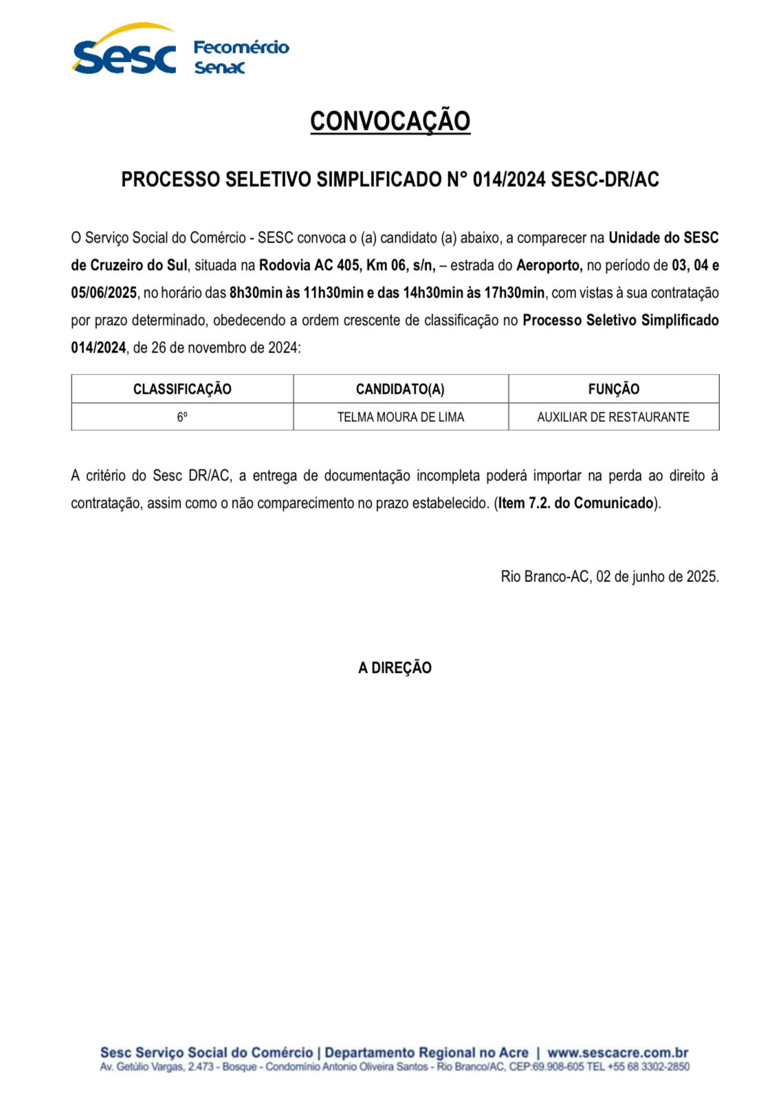 Convocação Processo Seletivo Simplificado n° 014/2024 Sesc-DR/AC
