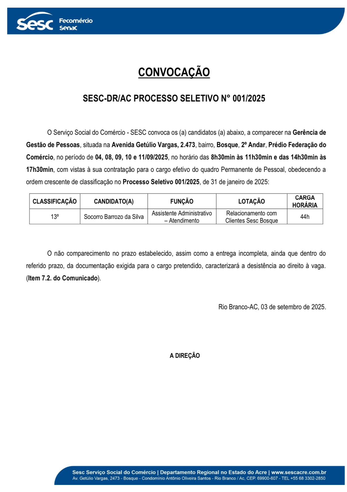 Convocação Sesc-DR/AC Processo Seletivo N° 001/2025