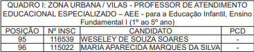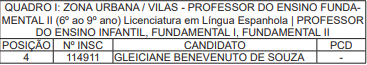 A lista traz nomes para funções como Professor de Atendimento Educacional Especializado (AEE) e Professor do Ensino Fundamental II – Língua Espanhola.