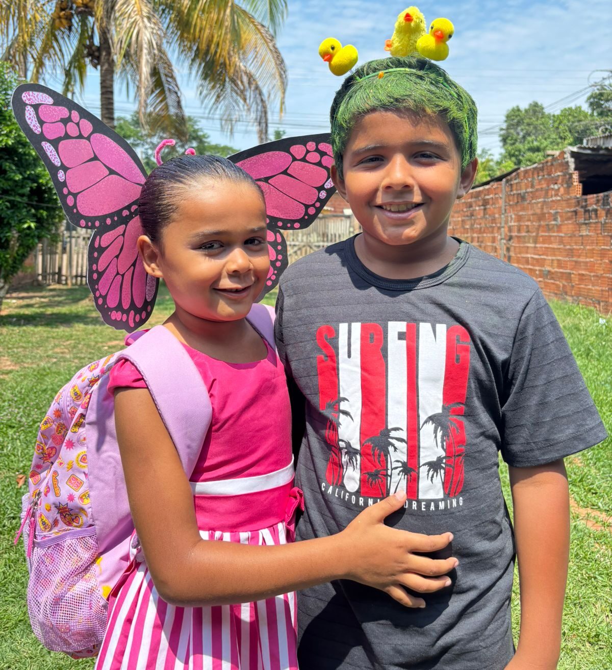 “A Hefanny escolheu o tema borboleta e ficou encantada com o cabelo que fizemos juntas. Já o Hefanan quis ser um pintinho, porque adora animais. Eles se divertiram tanto! Ver a alegria deles foi uma alegria minha também. A gente se envolve e volta a ser criança com eles”, disse emocionada.