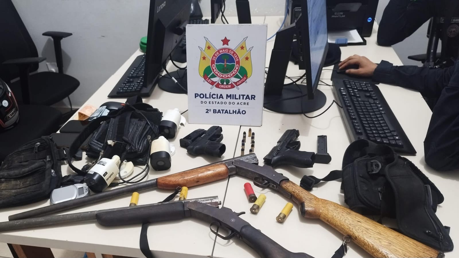 Durante a abordagem, foram encontradas duas pistolas, duas espingardas, munições, dinheiro, aparelhos celulares, uma balança de precisão e outros objetos. Os suspeitos foram detidos e encaminhados à Delegacia de Flagrantes (Defla) para os procedimentos legais.