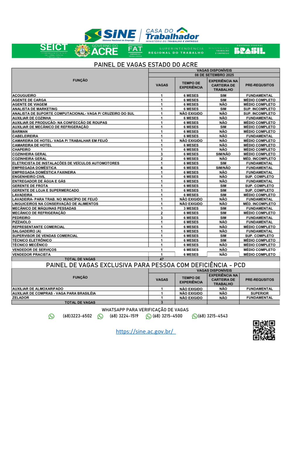 O Sistema Nacional de Emprego do Acre (Sine-AC) oferece 47 vagas de emprego para a população de Rio Branco nesta segunda-feira (16). Destas vagas, três são destinadas exclusivamente às pessoas com deficiência.