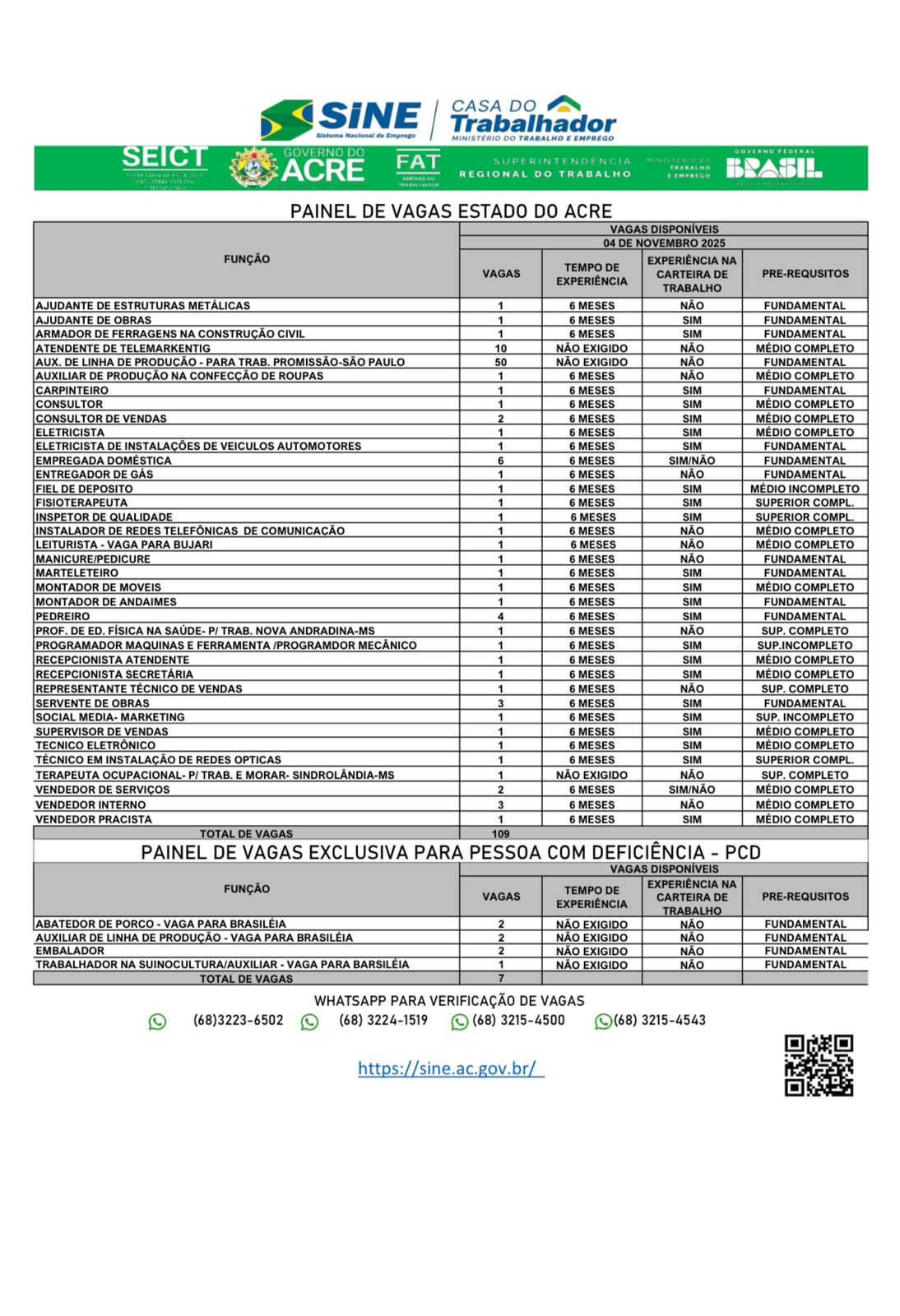 Os candidatos que ainda não possuem cadastro ou que precisam atualizá-lo devem entrar em contato com o Sine para regularizar sua situação. O cadastro pode ser feito via WhatsApp pelos números 3223-6502, 3224-1519 ou 3215-4500.