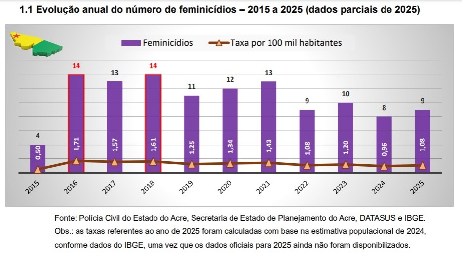 Somado a esse caso, o Acre registra, em 2025, 10 casos de feminicídio. Os números ultrapassam os casos de 2022, quando houveram 9 registros, e de 2024, com 8 registros. O ano de 2025 se iguala ao ano de 2023 em números. Os dados são do Relatório de Violência Doméstica e Familiar contra a Mulher, elaborado todos os meses pela Polícia Civil do Acre.