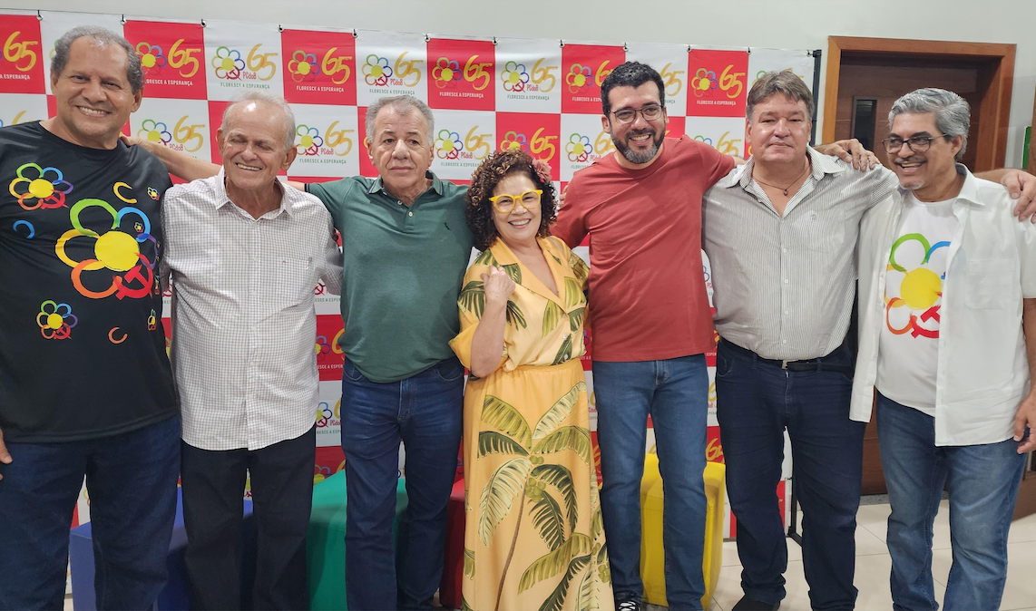 Na foto, presidente do partido, Eduardo Farias, a ex-deputada federal Perpétua Almeida, deputado estadual Edvaldo Magalhães (D), com os aliados César Messias, presidente estadual do PSB, Vagner Sales, presidente do MDB do Acre, André Kamai, presidente do Partido dos Trabalhadores, e Leonardo Melo, filho do ex-governador Flaviano Melo