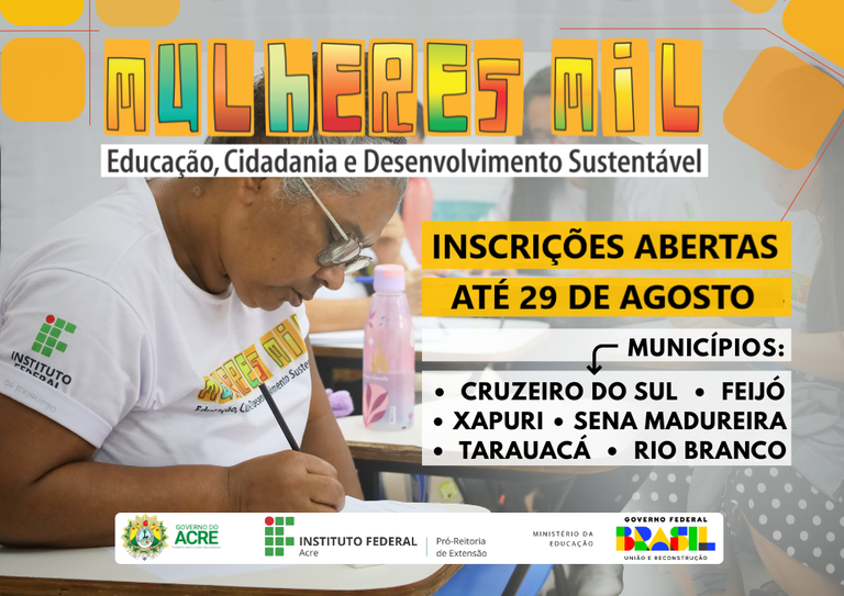 O Instituto Federal do Acre (Ifac), por meio da Pró-reitoria de Extensão (Proex), abre nesta quinta-feira (21/08) as inscrições para os cursos do Programa Mulheres Mil. O prazo segue até o dia 29 de agosto. A previsão é que as primeiras turmas iniciem em 29 de setembro de 2025, com continuidade em 2026.