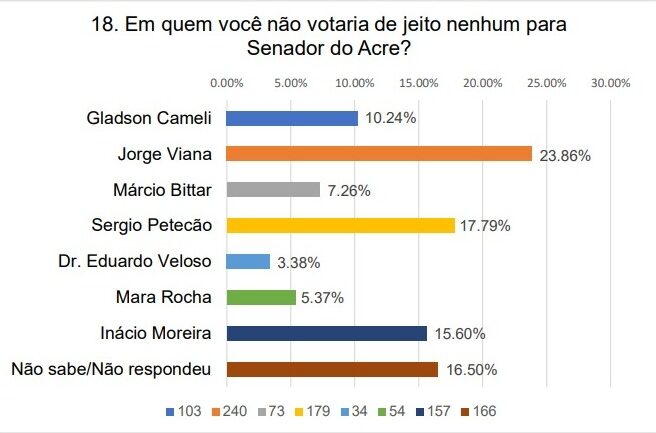 A pesquisa da agência Delta, encomendada pela TV Gazeta e divulgada nesta segunda-feira (23), traz um dado interessante que o ex-governador do Acre Jorge Viana (PT) é o nome com maior rejeição entre os pré-candidatos para o senado, com 23,86%.