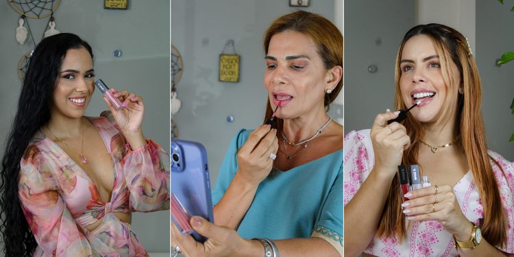 As influenciadoras Clícia Virgínia, Márcia Abreu e Tatiane Valente experimentando os batons líquidos Make B.