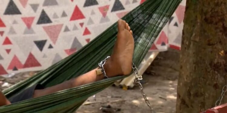 A senhora Raimunda de Souza Claudino, de 49 anos, do bairro Polo Benfica, em Rio Branco, pediu ajuda às autoridades após acorrentar o próprio filho, de 18 anos, na tentativa de impedir que ele agrida familiares e coloque a própria vida em risco. Segundo ela, o jovem enfrenta transtornos comportamentais desde os 14 anos, faz uso de drogas, além de ser “muito violento” com os próprios familiares.