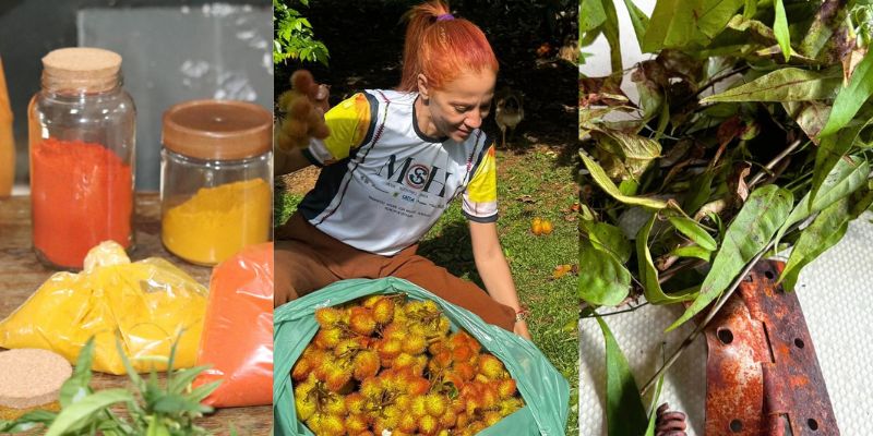 Alguns dos materiais utilizados para tingir as roupas do desfile / Fotos: Redes Sociais