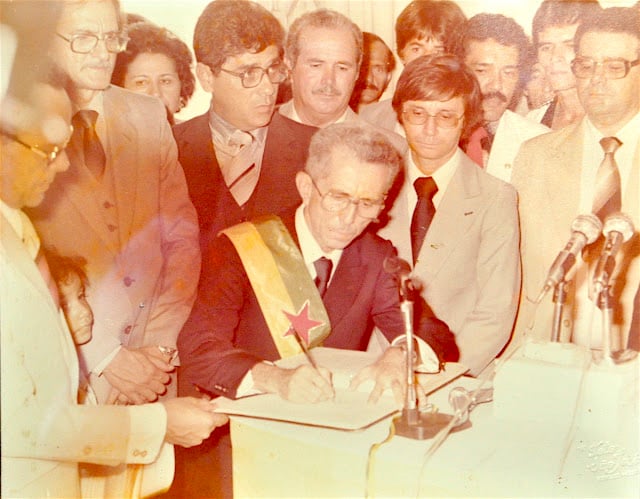 Posse de Nabor Júnior em 1982: um marco político no Acre ao derrotar o candidato da ditadura e inaugurar um novo ciclo democrático. – Imagem: Reprodução