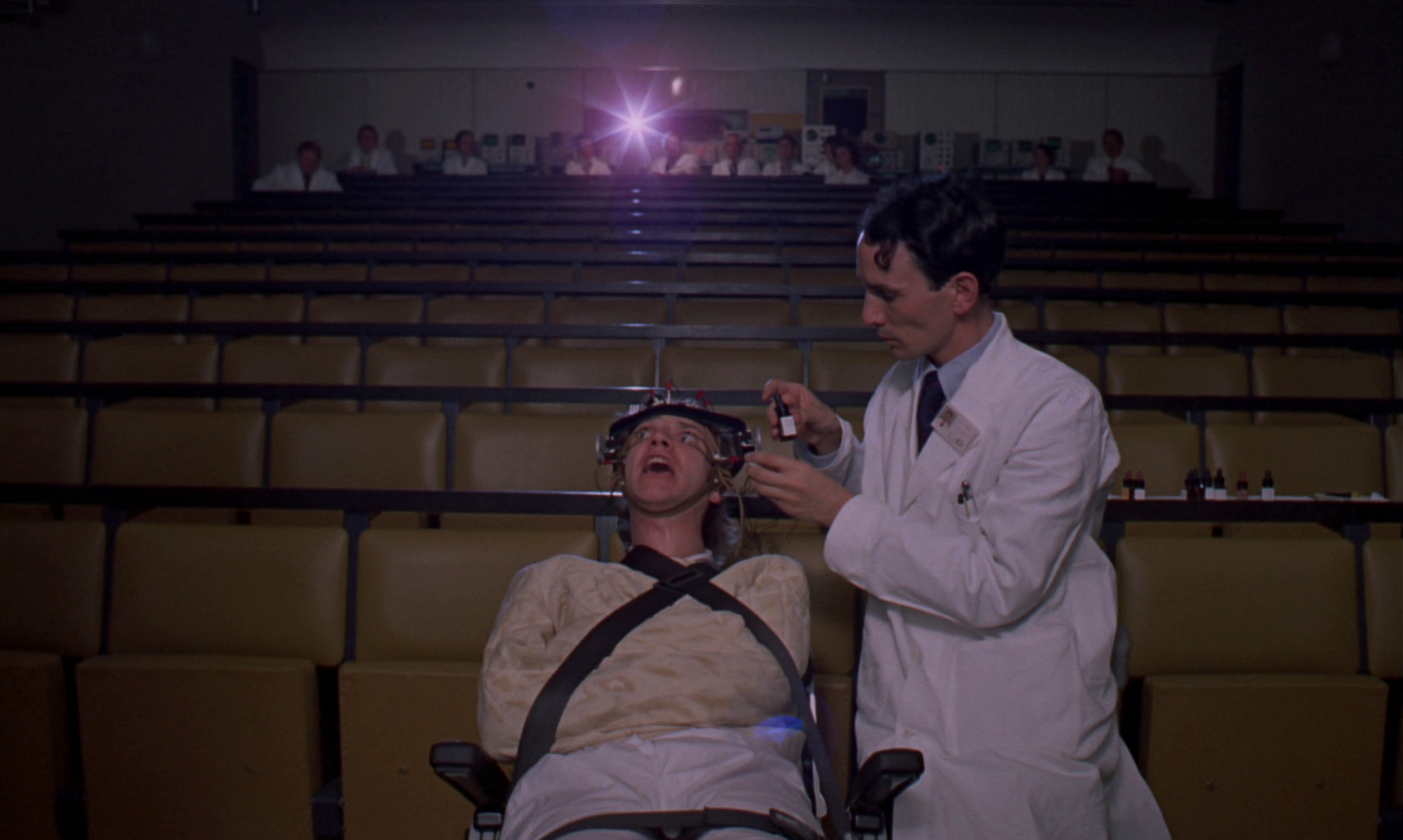 Aí vem o Tratamento Ludovico, a grande piada cruel do filme com o behaviorismo radical de B.F. Skinner. A ideia é simples: prendem Alex numa cadeira, abrem os olhos dele à força com grampos (sim, é tão horrível quanto parece) e o obrigam a assistir filmes de ultraviolência enquanto injetam uma droga que provoca náusea insuportável. Resultado? Depois de duas semanas, só de pensar em socar alguém o estômago dele revira. O comportamento violento foi extinto. Parabéns, ciência.