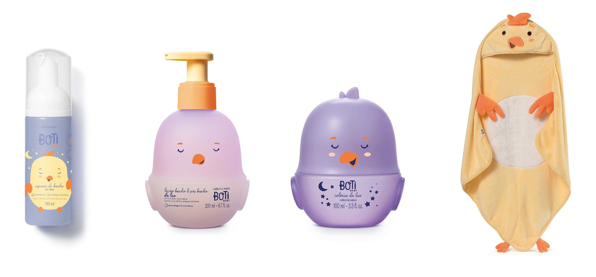 A linha Boti Baby Lua reúne Espuma de Banho, Loção Hidratante e Colônia que, quando usados em conjunto, criam uma atmosfera calma e tranquila. Com fórmula vegana, cruelty free e segura desde os primeiros dias de vida, os produtos são testados por pediatras e dermatologistas para garantir total proteção à pele delicada. Sua fragrância combina a suavidade da lavanda e da camomila romana com um toque cítrico e fundo de musk e baunilha, resultando em um cheirinho acolhedor que ajuda a tranquilizar o pequeno para uma noite de sono serena.