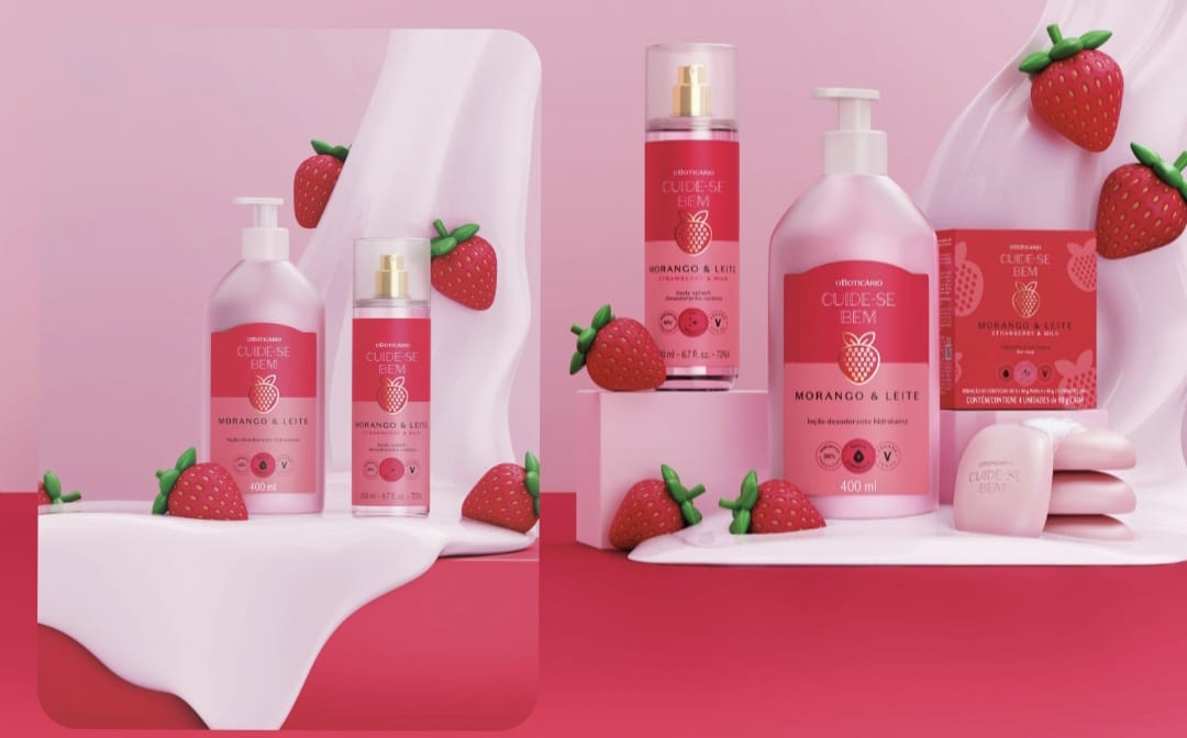 Todos os itens têm o cheirinho delicioso e docinho, inspirado na combinação do morango com o leite e trazem uma proposta de autocuidado completa para o corpo. Além disso, as novas fórmulas são 100% veganas, livres de testes em animais e privilegiam o uso de ingredientes naturais. A combinação dos produtos potencializa e prolonga a perfumação, além de promover um momento de autocuidado ainda mais gostoso e indulgente.