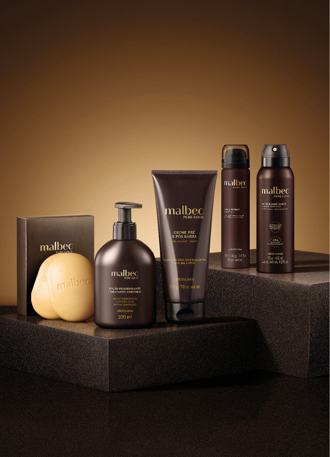Além do desodorante colônia, protagonista do lançamento, Malbec Pure Gold chega ao portfólio acompanhado de produtos para uma rotina de cuidados completa, que exala poder e sedução. A Loção Hidratante Desodorante Corporal oferece hidratação com textura leve, mantendo o rastro olfativo da fragrância por mais tempo na pele. O Spray Íntimo é uma extensão funcional, que oferece frescor e perfumação prolongada para o homem moderno, enquanto o Creme Pré e Pós-Barba prepara a pele para o barbear e proporciona conforto após a lâmina, mantendo a hidratação com um toque perfumado. Enquanto o Sabonete em Barra, com sua espuma cremosa e perfumada, junto com o Desodorante Antitranspirante Aerossol, complementam a experiência sensorial da linha, com soluções desde o banho.