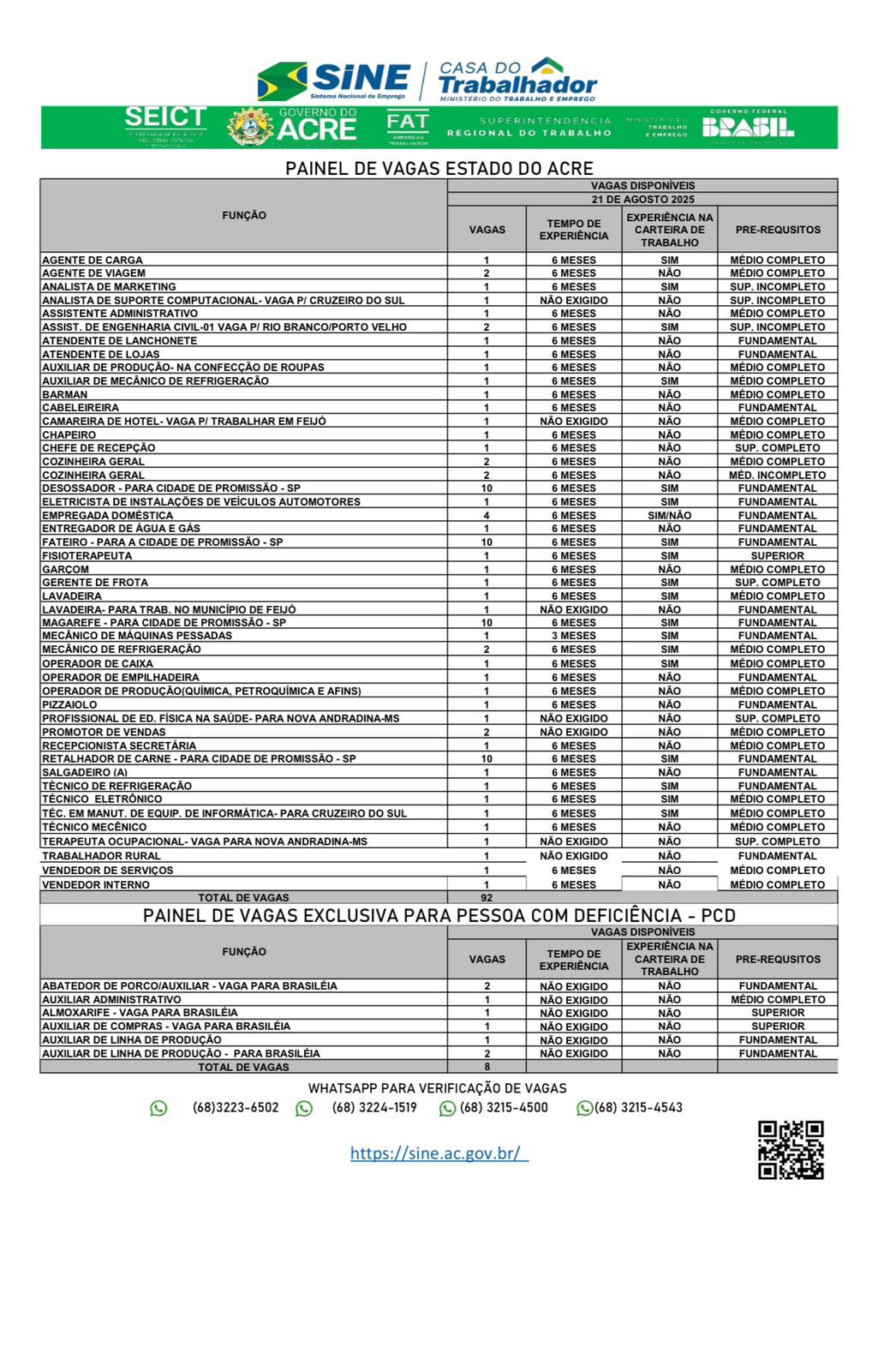 O Sistema Nacional de Emprego do Acre (Sine-AC) oferece 92 vagas de emprego para a população de Rio Branco nesta quinta-feira (21). Destas vagas, oito são destinadas exclusivamente às pessoas com deficiência.