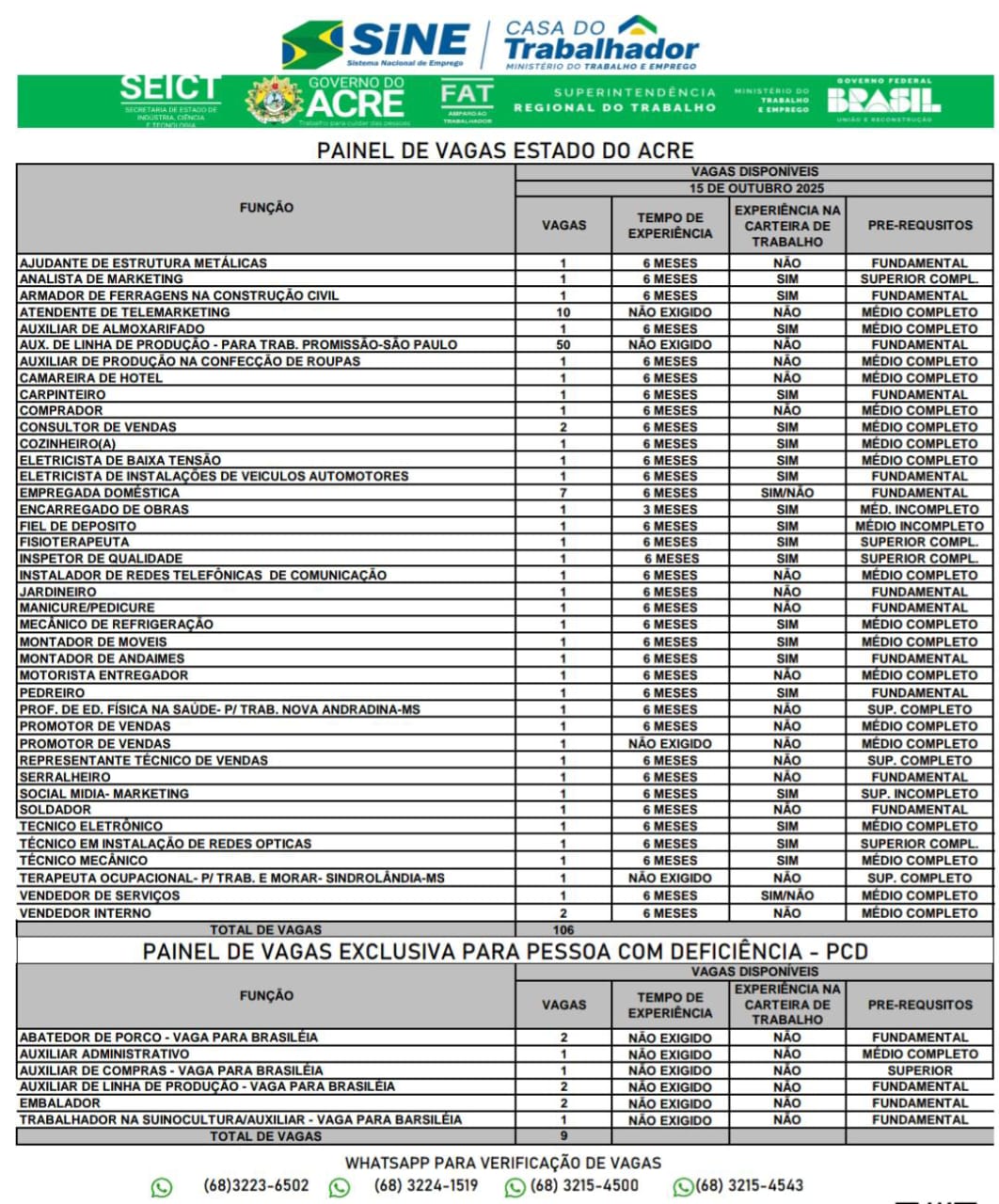 O Sistema Nacional de Emprego do Acre (Sine-AC) oferece 115 vagas de emprego para a população de Rio Branco nesta quarta-feira (15). Destas vagas, 9 são destinadas exclusivamente às pessoas com deficiência.